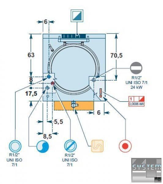 Нагрев прямого типа, создаваемый двумя независимыми группами горелок (12 + 12 кВт) из нержавеющей стали с оптимизированным сгоранием, с предохранительным клапаном, оснащенным термопарой, и защищенным пилотным огнем.