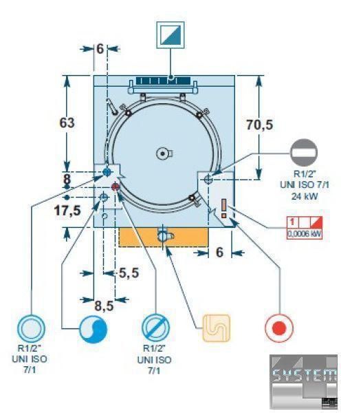 Нагрев непрямого типа с помощью пара под давлением, создаваемого внутри воздушного промежутка двумя независимыми группами горелок (12 + 12 кВт) из нержавеющей стали с оптимизированным сгоранием, с предохранительным клапаном, оснащенным термопарой, и защищенным пилотным огнем.