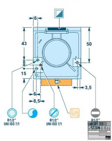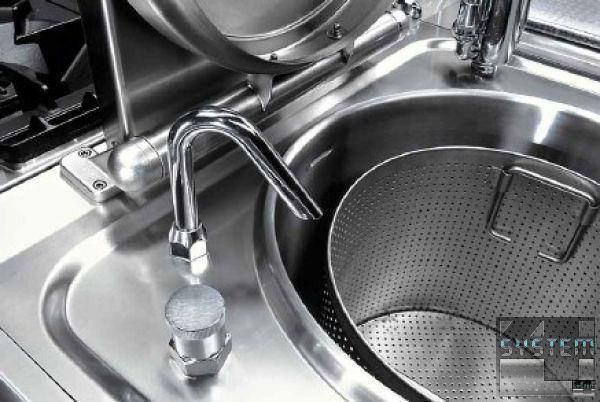 Краны залива холодной и горячей воды, расположенные на рабочей поверхности, предназначенные для заполнения и промывки емкости. Сливной кран из хромированной латуни с термостойкой ручкой.