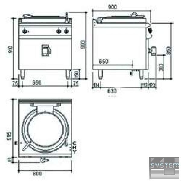 Основная часть сделана из сатинированного хромоникелевого листа 18/8 н/с. Покрытие с двойными стенками специально разработано для упрочнения. Температура регулируется в пределе 60-180 °C посредством многоуровневого термостата. Непрямая готовка при помощи масла в кожухе. Температура кипения масла в кожухе составляет около 2000С. Оборудован вентилями для наполнения воды (горячей/холодной) и ее опустошения. С целью предотвращения случайного открытия специально для приготовленной пищи разработан вентиль безопасного опустошения. В случае неполадки ограничительный термостат автоматически прекращает подачу энергии. Все электрические приборы и механизмы соответствуют международным стандартам.