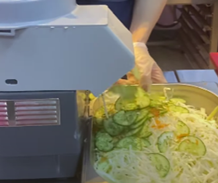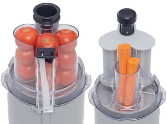 Боковой выброс продуктов позволяет использовать емкости большого размера и реже убирать нарезанные продукты из емкости.