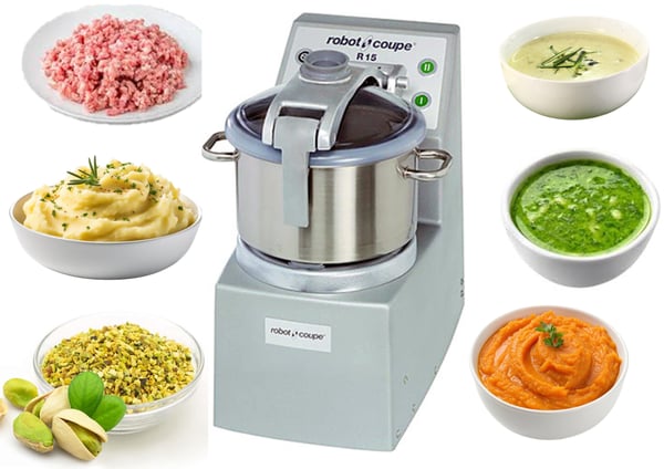 Модель кутера Robot-Coupe R15 разработана для измельчения, приготовления тонких фаршей, паштетов, кремов и соусов, взбивания сливок, эмульсий и муссов, размола и замешивания теста, измельчения зелени, специй, суфле путем быстрого и тонкого измельчения продуктов. Куттер позволяет даже замешивать тесто как на пельмени. Также позволяет рубить мясо на мелко рубленую и кнельную массу, измельчать лук, чернослив, курагу, кальмары, вареное мясо, творог, вареные яйца.
