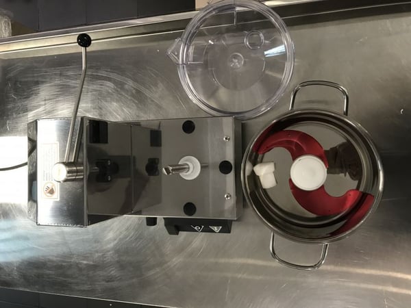 Чаши куттера выполнена из высококачественной нержавеющей стали AISI 304 с термическим днищем и ручками. Крышка изготовлена из прозрачного материала Lexan даёт хороший обзор во время обработки и оснащена отверстием для добавление ингредиентов на ней.