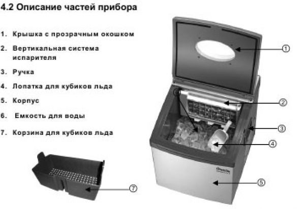 Лдогенератор имеет датчик наполненности резервуара для льда и автоматически прекращает производить лед при заполнении резервуара.