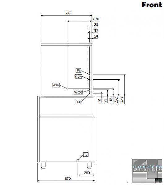 Профессиональный льдогенератор имеет габаритные размерами: 870мм (длина), 790мм (глубина), 1800мм (высота).