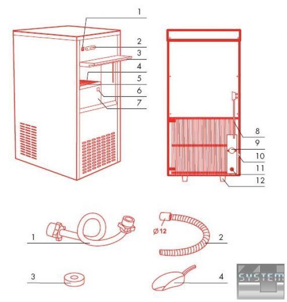 Комплект поставки: 1. Труба для подачи воды 2. Труба слива воды 3. Уплотнительное кольцо 4. Совок для льда