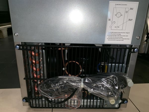 Льдогенератор необходимо подключать к водопроводу и канализации. Охлаждение воздушное. Корпус агрегата выполнен из высококачественной нержавеющей стали и металла с полимером, в нижней части перфорация для забора воздуха.