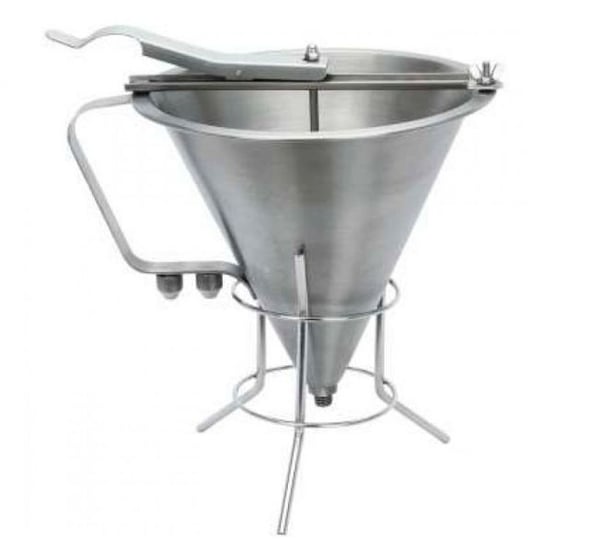 Воронка-дозатор полностью выполнена из высококачественной нержавеющей стали, имеет ручку и нажимной механизм.