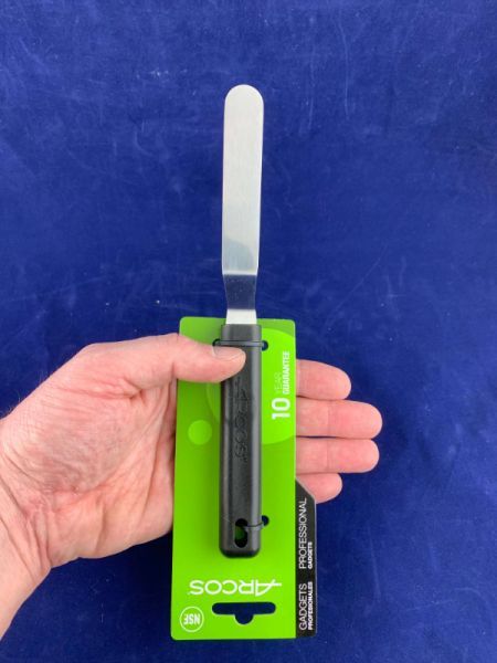 Шпатель блинный относится к профессиональному кондитерскому инвентарю для кафе, кондитерских, пекарень и ресторанов. Предназначен для нанесения крема на поверхность торта и его выравнивания. Данный инструмент также можно применить при сборке многоярусного торта.