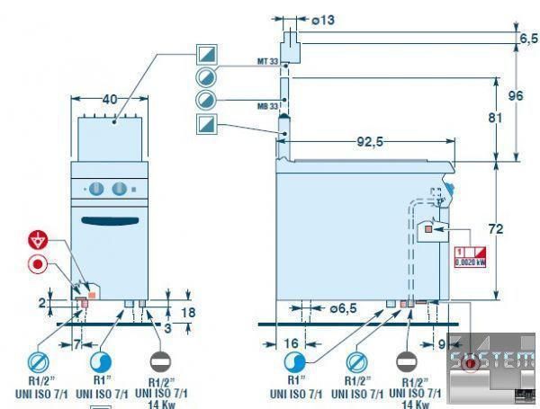 Разогрев прямого типа, создаваемый группой горелок из нержавеющей стали с пилотным огнем, термопарой и предохранительным клапаном, регулируется переключателем - от 7 до 14 кВт.
