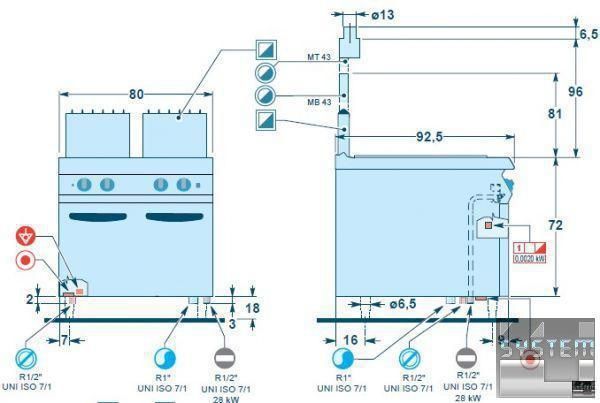 Разогрев прямого типа, создаваемый группой горелок из нержавеющей стали с пилотным огнем, термопарой и предохранительным клапаном, регулируется переключателем - от 7 до 14 кВт для каждой ванной отдельно.