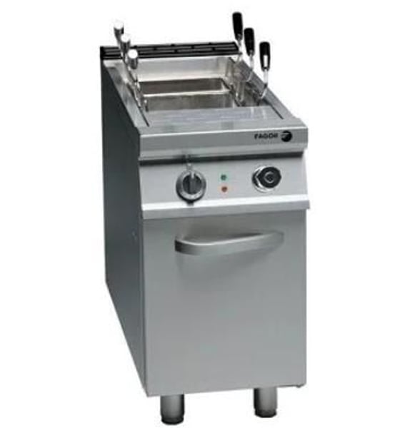 Напольная электрическая пастоварка оснащена 1 ванной с краном для слива воды. В ванну помещается сетчатая корзина для отваривания, наполненная водой, которая снабжена термоустойчивой пластиковой ручкой.