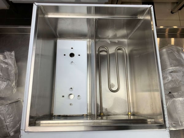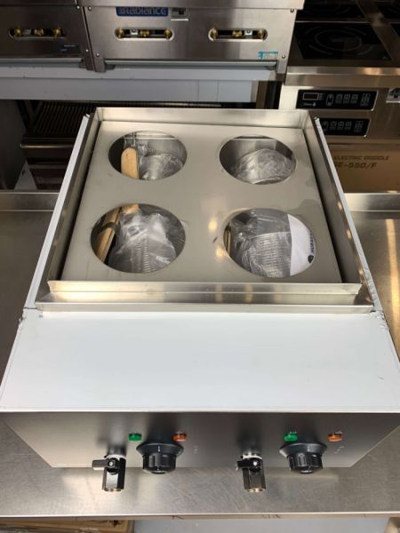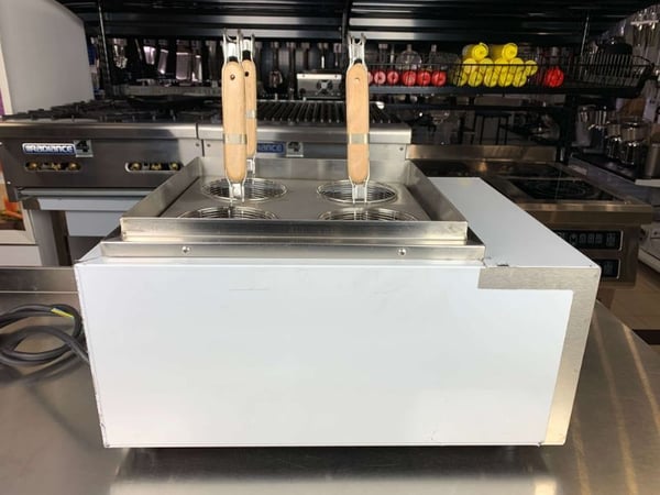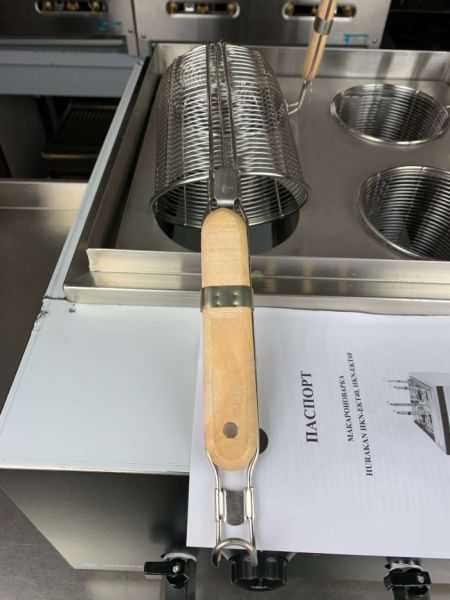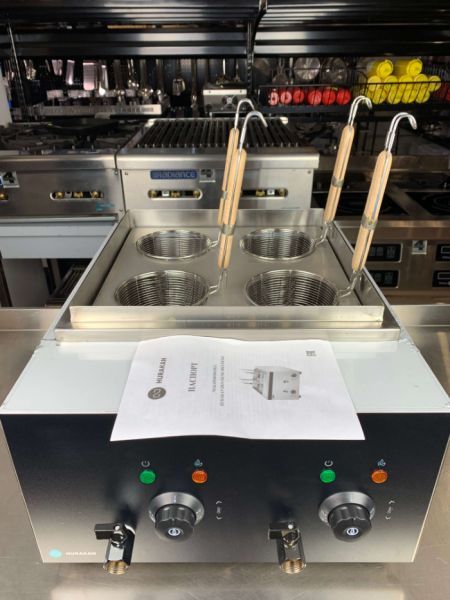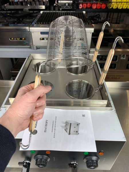 Настольная электрическая пастоварка оснащена 2 ваннами с кранами для слива воды. В каждую ванну помещается сетчатая корзина для отваривания, наполненная водой, которая снабжена термоустойчивой пластиковой ручкой. Корзина может быть поделена на несколько отделений-секций, что позволяет готовить одновременно разные виды тестовых изделий.