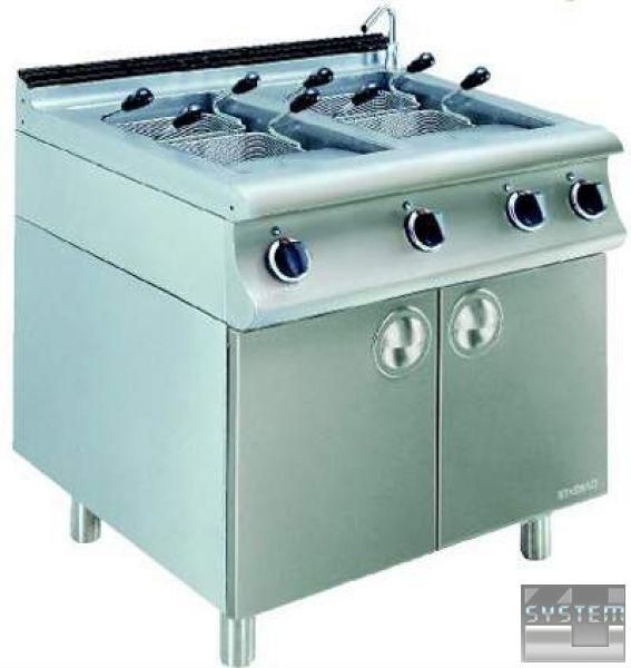 Сделана из сатинированного хромоникелевого листа 18/8 н/с. Газовые втулки с растопочным факелом, минимально-максимальное пламя и термоэлемент; в случае отключения газа подача газа прекращается автоматически. Может использоваться СНГ или природный газ, и преобразование происходит без каких-либо изменений. Внизу имеется шаровой вентиль 3/4" для стока воды из резервуара. Кнопка автоматического зажигания. Газовая горелка из нержавеющей трубы пригодна для использования газа различного типа. Втулка для наполнения воды регулируется посредством передней панели. Устройство для спуска воды с целью предотвращения переливания воды в резервуаре. Отдельное управление резервуаров. Регулируемая опора из нержавеющей трубы и каркасные листы толщиной 2 мм. Дверные ручки из нержавеющей стали.