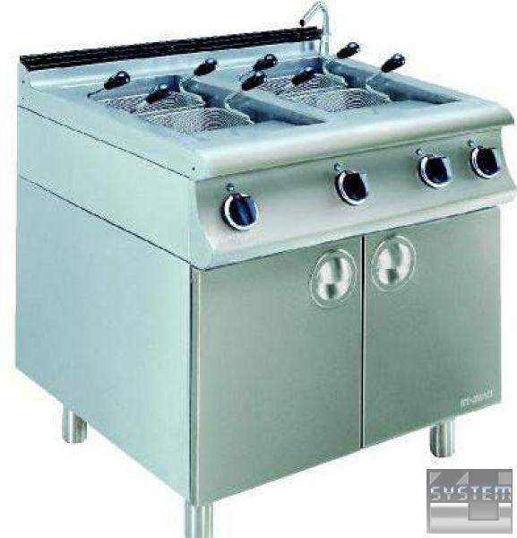 Сделана из сатинированного хромоникелевого листа 18/8 н/с. Газовые втулки с растопочным факелом, минимально-максимальное пламя и термоэлемент; в случае отключения газа подача газа прекращается автоматически. Может использоваться СНГ или природный газ, и преобразование происходит без каких-либо изменений. Внизу имеется шаровой вентиль 3/4" для стока воды из резервуара. Кнопка автоматического зажигания. Газовая горелка из нержавеющей трубы пригодна для использования газа различного типа. Втулка для наполнения воды регулируется посредством передней панели. Устройство для спуска воды с целью предотвращения переливания воды в резервуаре. Отдельное управление резервуаров. Регулируемая опора из нержавеющей трубы и каркасные листы толщиной 2 мм. Дверные ручки из нержавеющей стали.