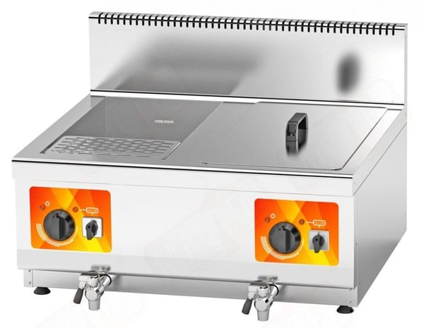 Настольная электрическая пастоварка оснащена 2 ваннами с кранами для слива воды. В каждую ванну помещается сетчатая корзина для отваривания, наполненная водой, которая снабжена термоустойчивой пластиковой ручкой. Корзина может быть поделена на несколько отделений-секций, что позволяет готовить одновременно разные виды тестовых изделий.