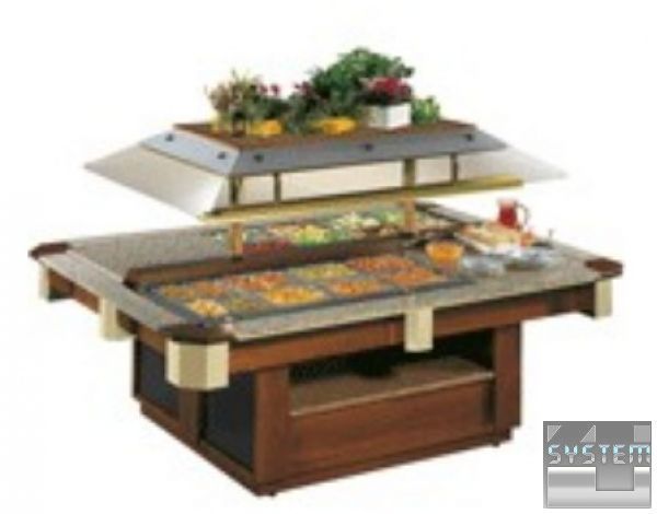 Модели прямоугольных салат-баров отличаются расположением охлаждающих и тепловых ванн для гастроемкостей.
