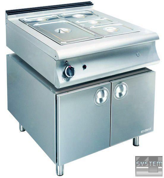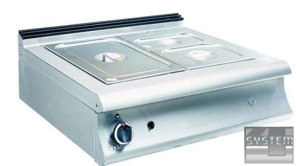 Температурный режим 30-90ºС. Основная часть сделана из сатинированного хромоникелевого листа 18/8 н/с, а внутренние принадлежности – из алитированного листа. Н/с резервуар пригоден для вставки в контейнеры НГ. Многоуровневый термостат регулируется в пределе 0-110° C, а также имеется защита от перегрева. Основной переключатель используется для подачи или прекращения энергии. Все электрические механизмы и приборы соответствуют международным стандартам. Пригодна для расположения со шкафомдля многофункционального использования или на консольном основании для установок изолированного типа. В комплект гастроемкости не входят.