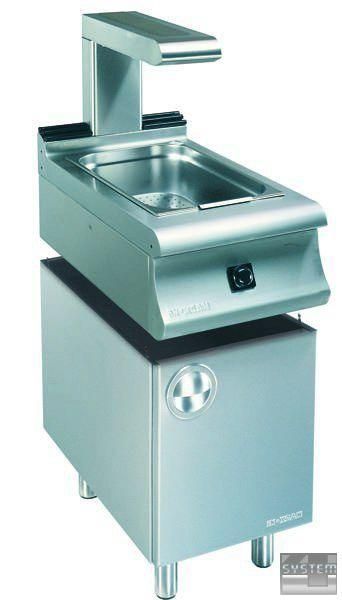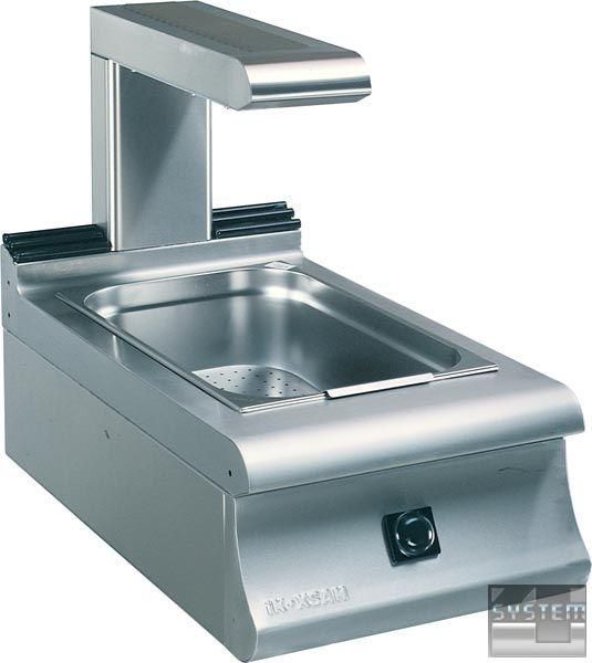 Сделано из хромоникелевого листа 18/8 н/с AISI 304. Пригодно для вставки контейнера НГ 1/1x150 мм и оснащено рукояткой для регулирования энергии. Сохранение теплоты картофеля обеспечивается за счет галотермической лампы 500 ватт, расположенной в верхней части. Фильтрация масла с обжаренного картофеля происходит за счет фильтрующей полки. Пригодно для многофункционального использования со шкафом или на консольном основании для установки изолированного типа.