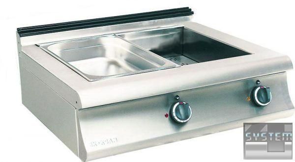 Температурный режим 30-90ºС. Основная часть сделана из сатинированного хромоникелевого листа 18/8 н/с, а внутренние принадлежности – из алитированного листа. Н/с резервуар пригоден для вставки в контейнеры НГ. Многоуровневый термостат регулируется в пределе 0-110° C, а также имеется защита от перегрева. Основной переключатель используется для подачи или прекращения энергии. Все электрические механизмы и приборы соответствуют международным стандартам. Пригодна для расположения со шкафомдля многофункционального использования или на консольном основании для установок изолированного типа. В комплект гастроемкости не входят.