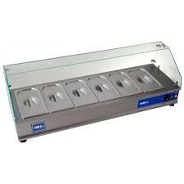 Мармит настольный модель ВТН-Р-6-1220 выпускается с 6-ю гастроемкостями GN 1/3, h 65 и гнутым фасадным стеклом. Удобный доступ к блюдам.