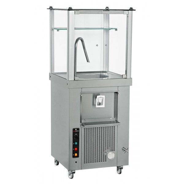 Корпус машины изготовлен из высококачественной нержавеющей стали, укомплектована решеткой крана и сливом для наполнения бокалов напиктом. Оснащен краном чистящего средства и слывным краном, также есть внутрення подсветка.