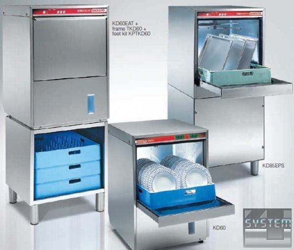 Модели KD60 ... могут быть расположены на раме модели TKD60 из нержавеющей стали AISI 304, открытый сверху и спереди с нижним отсеком для хранения стандартных корзин. Рама оборудована регулируемыми по высоте ножками, которые позволяют повысить высоту посудомоечной машины до 90 см. Дополнительный комплект ножек (130-220 мм высотой) позволяет чистить под рамой /посудомоечной машиной.