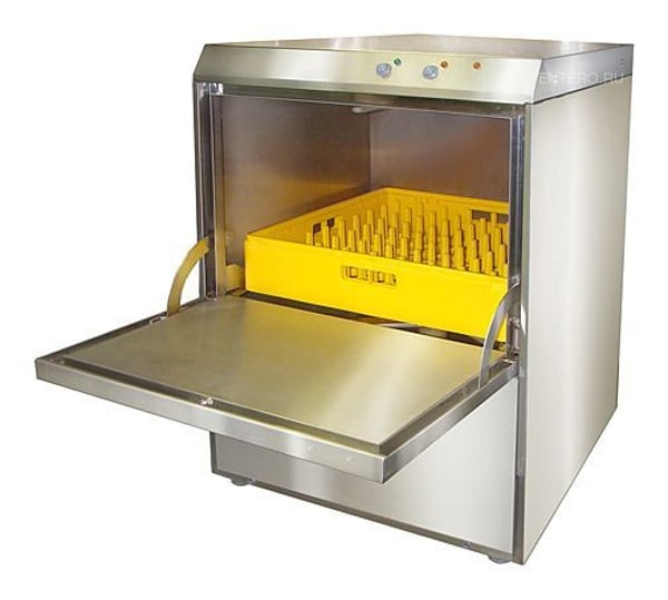 Моющаяся посуда располагается в пластмассовой кассете размером 50 х 50 см. Кассета устанавливается в машину и закрывается дверцей.