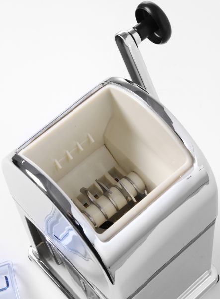 Корпус и ножи льдокрошителя изготовлены из нержавеющей стали, контейнер для готовой крошки из прозрачного поликарбоната. Резервуар для загрузки льда расположен сверху. В комплекте также есть лопатка.