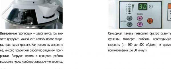 Незагрязняющаяся сенсорная панель. Простым нажатием выбирается скорость от 100 до 500 об/мин. Вы уже готовите следующее блюдо, пока планетарный миксер работает по таймеру (1–30 мин).