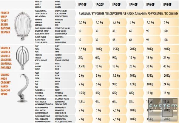 - оснащена съемной дежой,быстроразъемным креплением рабочих органов, 3-скоростным переключателем, таймером на 0÷15 минут (только в моделях IP/60F- IP/80F), защитой двигателя от перегрузок (кроме модели IP/10F),тележкой для откатывания дежи (только в моделях IP/60F - IP/80F);