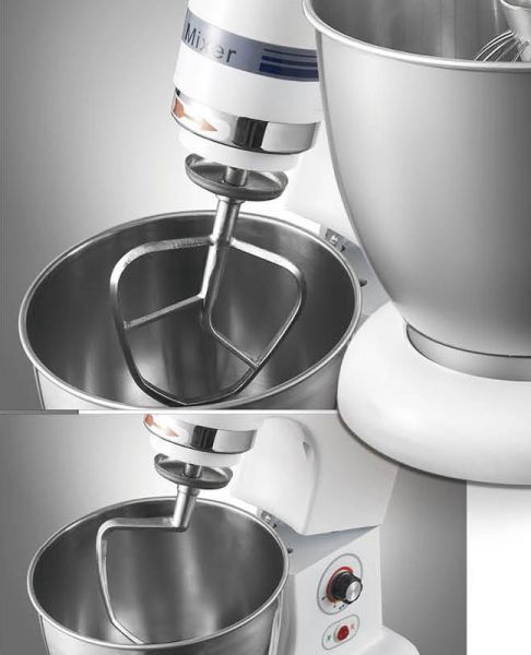 Данный миксер используется для замеса теста различного типа, фарша, крема, майонеза и т.д. Миксер оборудован съемной дежей, объемом 7 литров, в комплекте венчик, лопатка и крюк, легко снимаются. Миксер имеет 5 скоростей и привод с подъемным механизмом.