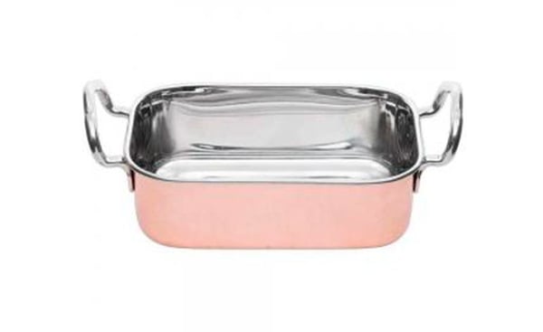 Закусочное блюдо выполнено из меди, идеально подойдет для профессиональной подачи морепродуктов, картофеля фри и жареных овощей.