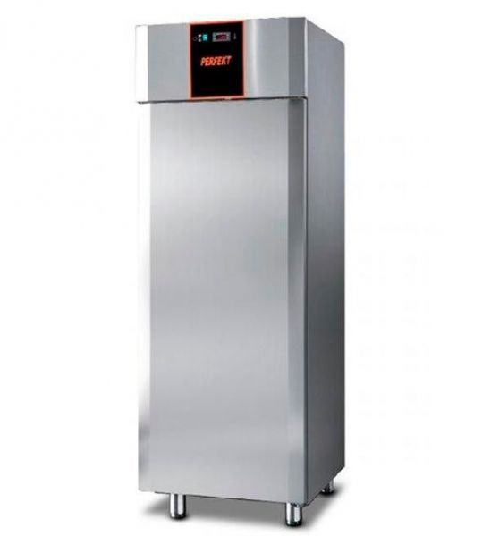 Одна глухая дверь с автоматическим блокирующим устройством. Рабочая температура составляет -18 ºC, -22 ºC, объем шкафа 700л, 3 полки с пластиковым покрытием для гастроемкостей размером GN 2/1., толщина термоизоляции 60 мм.