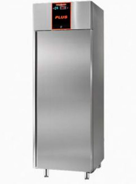 Одна глухая дверь с автоматическим блокирующим устройством. Рабочая температура составляет -18 ºC, -22 ºC, объем шкафа 700л, 3 полки с пластиковым покрытием, встроенный стеллаж под GN2/1, LED подсветка, толщина термоизоляции 50 мм.