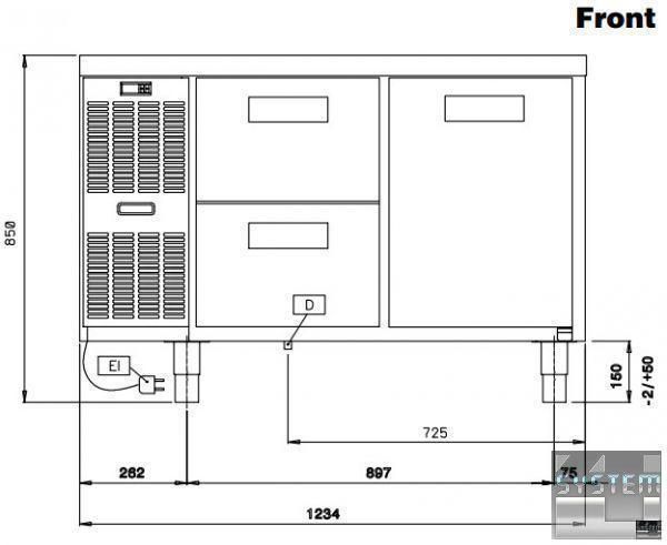 Профессиональный стол с охлаждением имеет габаритные размерами: 1238мм (длина), 700мм (глубина), 850мм (высота).