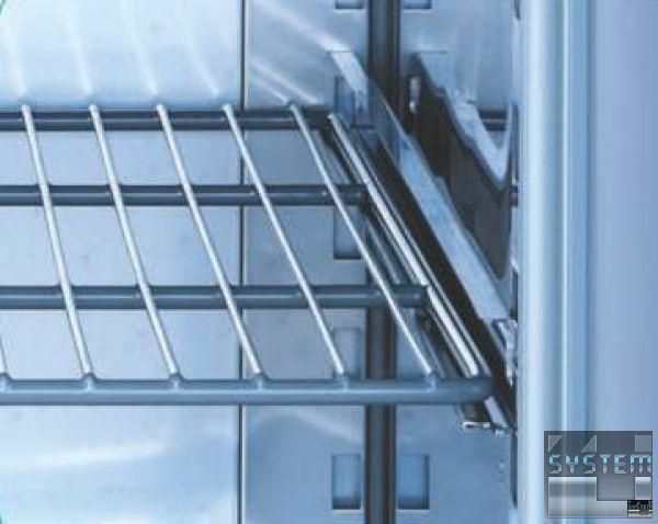 Снабжен держателями решетки против опрокидывания, и благодаря этой системе можно частично извлекать решетку или противень избегая опрокидывания. Оснащен пластифицированными решетками.