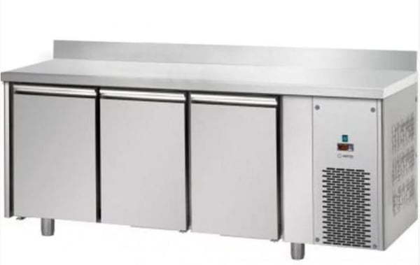 Стол с тремя распашными дверьми с возвратным механизмом, также подогрев по контуру двери препятствует образования конденсата, 1 полка GN 1/1 в каждом отделении. Боковое расположение компрессора и встроенный агрегат, извлекаемый для технического обслуживания.