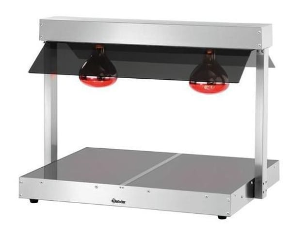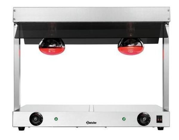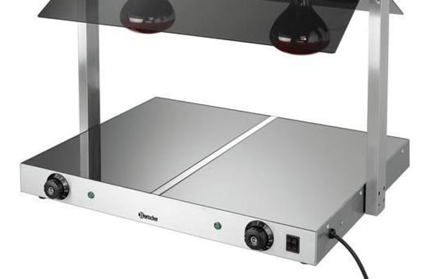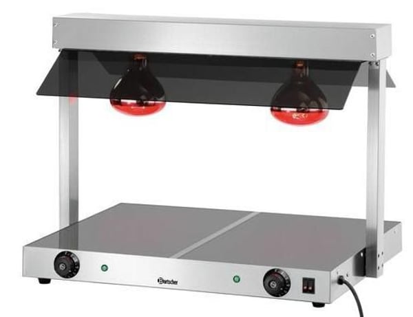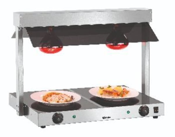 Это дает двойной тепловой эффект - регулируемые по отдельности две инфракрасные лампы и стеклокерамические нагревательные пластины поддерживают пищу теплой при индивидуально настроенной температуре.