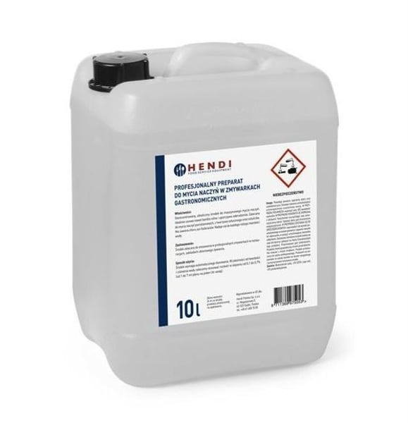 Рекомендуется использовать средство Hendi для мытья посуды из нержавеющей стали, пластика и фарфора (за исключением алюминия). Для достижения высокого блеска, лучше всего использовать ополаскивающее средство Hendi 975022