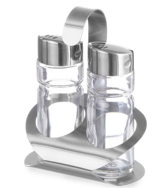 Набор для специй состоит из перечницы, солонки и подставки. Перечница и солонка выполнены из стекла, а подставка и крышечки - нержавеющая сталь.