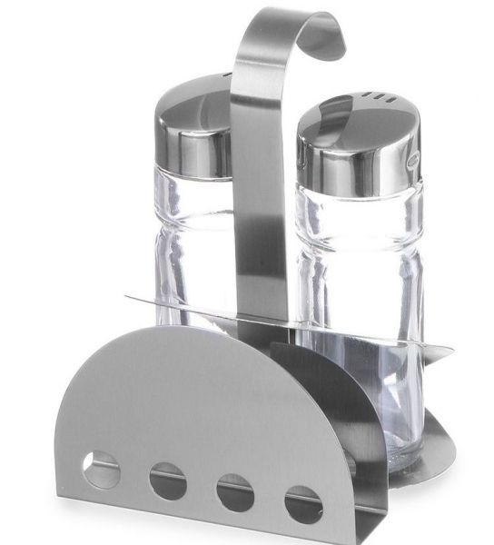 Набор для специй состоит из перечницы, солонки, салфетницы и подставки. Перечница и солонка выполнены из стекла, а подставка, салфетница и крышечки - нержавеющая сталь.