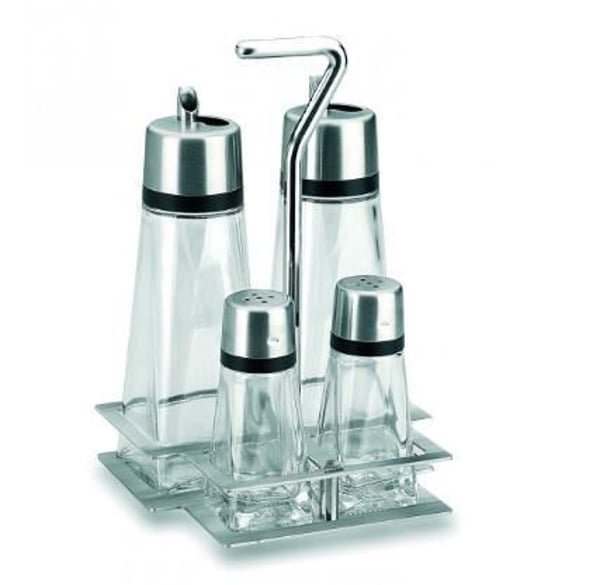 Крышка каждой бутылочки и подставка для специй выполнены из высококачественной нержавеющей стали 18/0, которая характеризуется высокой стойкостью и разрешена для контакта с пищевыми продуктами.