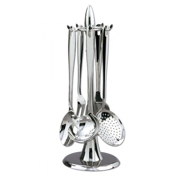 Набор состоит из пяти кухонных предметов: лопатки с отверстиями, шумовки, вилки для мяса, поварской ложки, половника и стойки, на которой они крепятся, идеально подходит для любой профессиональной кухни заведений общественного питания.