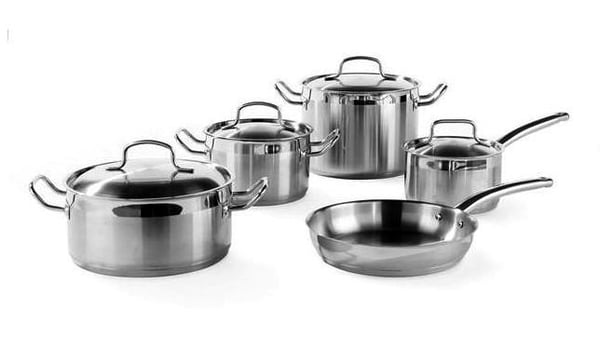 Набор кастрюль, с крышками и сковорода, выполнены из высококачественной нержавеющей стали.