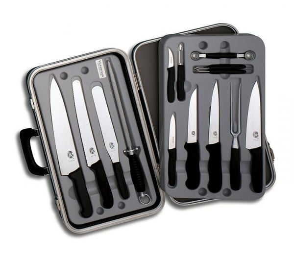 Набор профессиональных кухонных ножей поставляются в фирменном кейсе с нанесенным логотипом Victorinox.