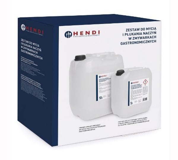 Набор Hendi для посудомоечной машины включает в себя моющее средство Hendi 975053 и ополаскивающее средство Hendi 975022.