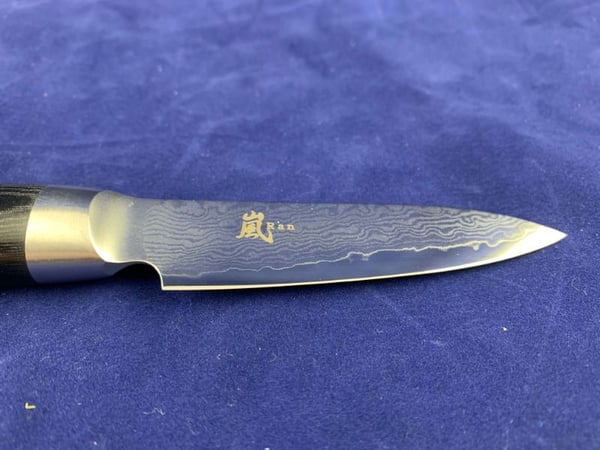 Основной материал из которго выполнен нож - VG10 (3 слоя - кобальт+молибден+ванадий) "супер нержавеющая сталь", который и покрывает лезвие с обеих сторон. На клинке отчетливо, не вооруженным глазом видна линия волны на лезвии. Лезвие имеет чрезвычайно острый угол нарезки и длительную производительность резки.