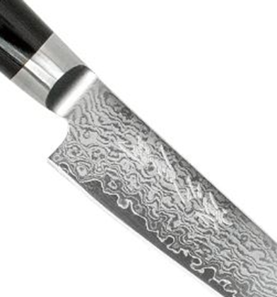 •В основе клинка имеется высококачественная сталь VG10 (кобальт, молибден, ванадий), покрытая защитными обкладками из 36 слоев нержавеющей стали с эффектным дамасским узором на лезвии.