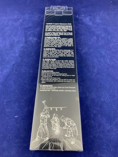Основной материал из которго выполнен нож - VG10 (3 слоя - кобальт+молибден+ванадий) "супер нержавеющая сталь", который и покрывает лезвие с обеих сторон. На клинке отчетливо, не вооруженным глазом видна линия волны на лезвии. Лезвие имеет чрезвычайно острый угол нарезки и длительную производительность резки.
